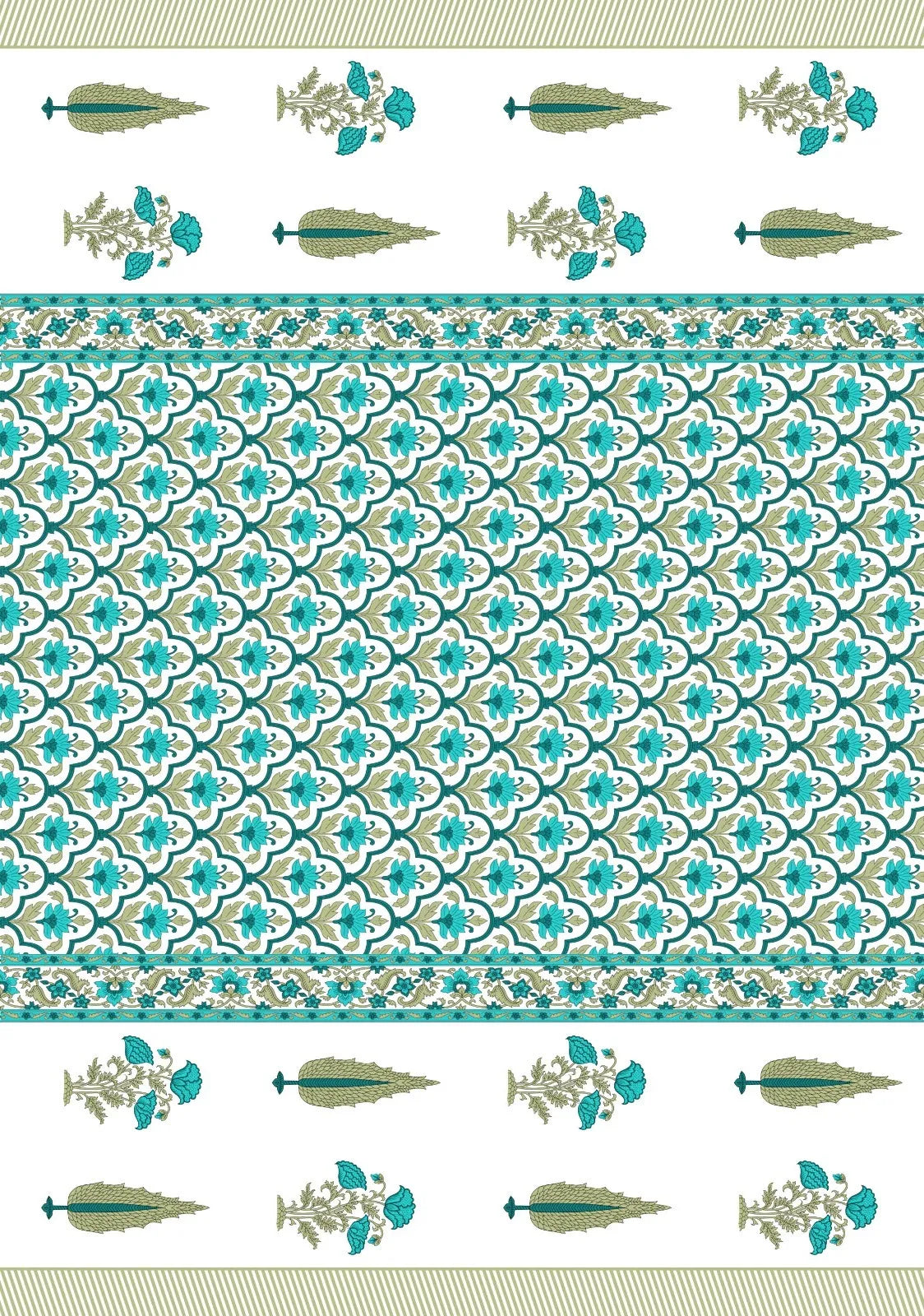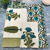 Ans. These Thejaipuri.com towel sets feature a block print design. Block printing is a traditional technique that uses carved wooden blocks to create unique and intricate patterns on fabric.