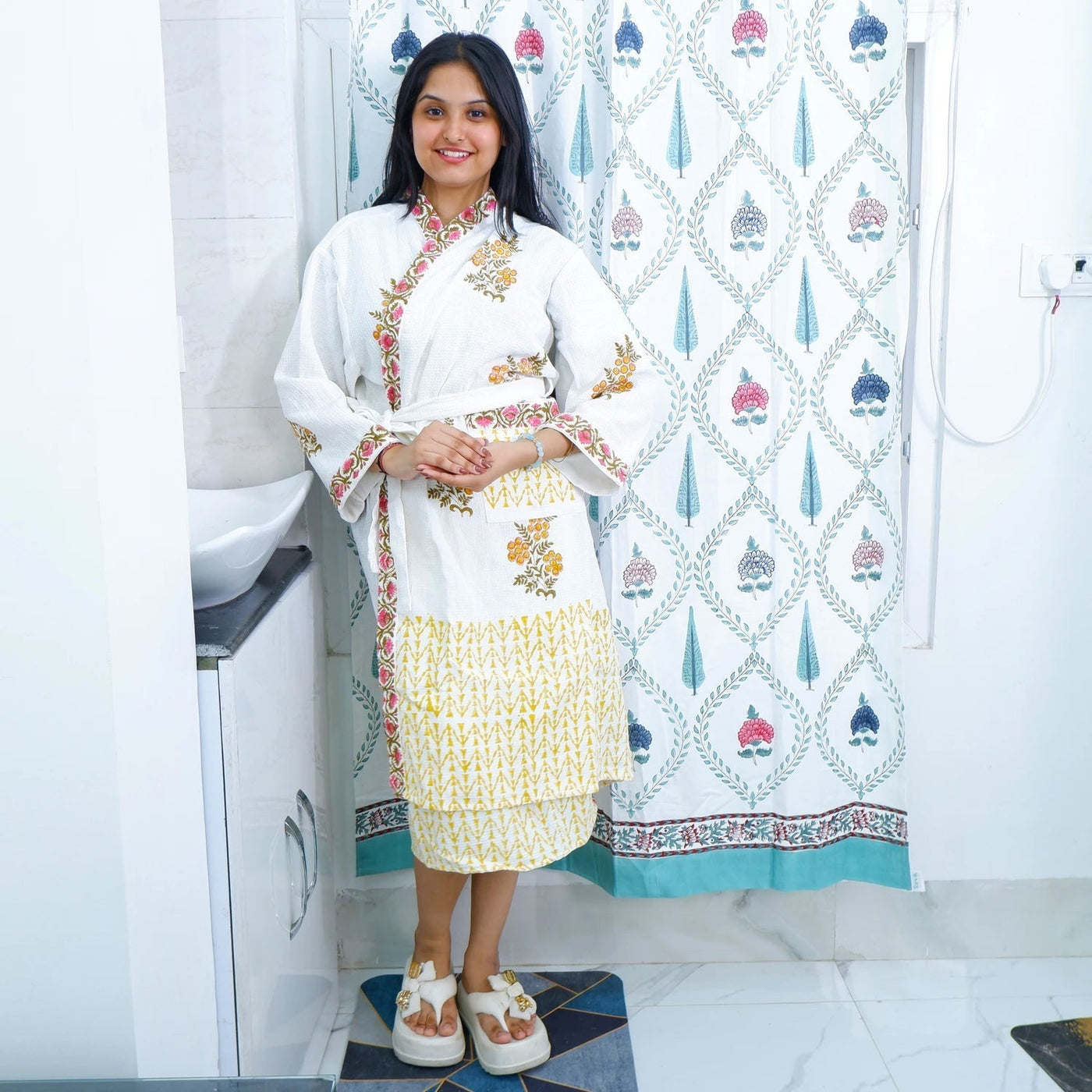 Ans. This luxurious bathrobe is crafted from 100% Madurai cotton, known for its exceptional softness, breathability, and lightweight comfort.