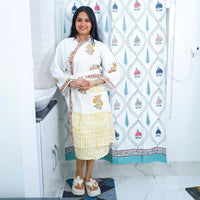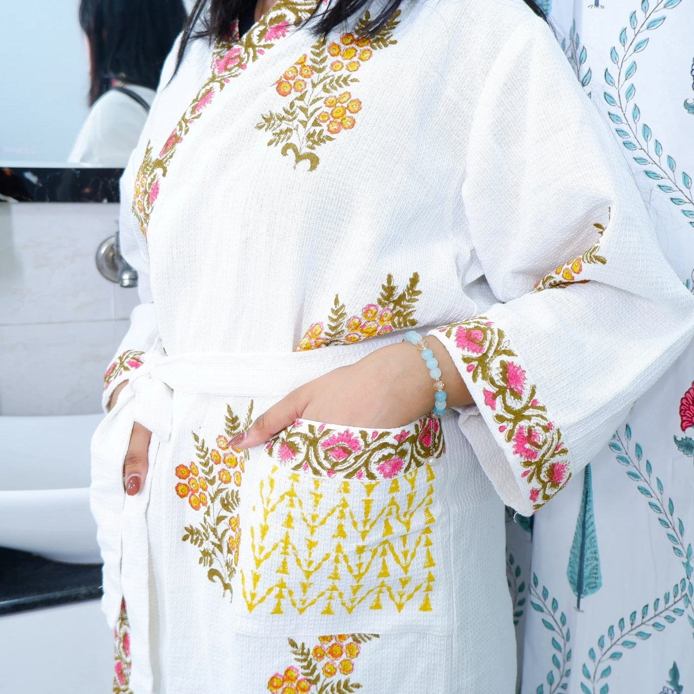Ans. Thejaipuri.com offers a variety of beautiful hand block printed designs on their Madurai cotton bathrobes. You can explore their website (Thejaipuri.com) to see the current collection.