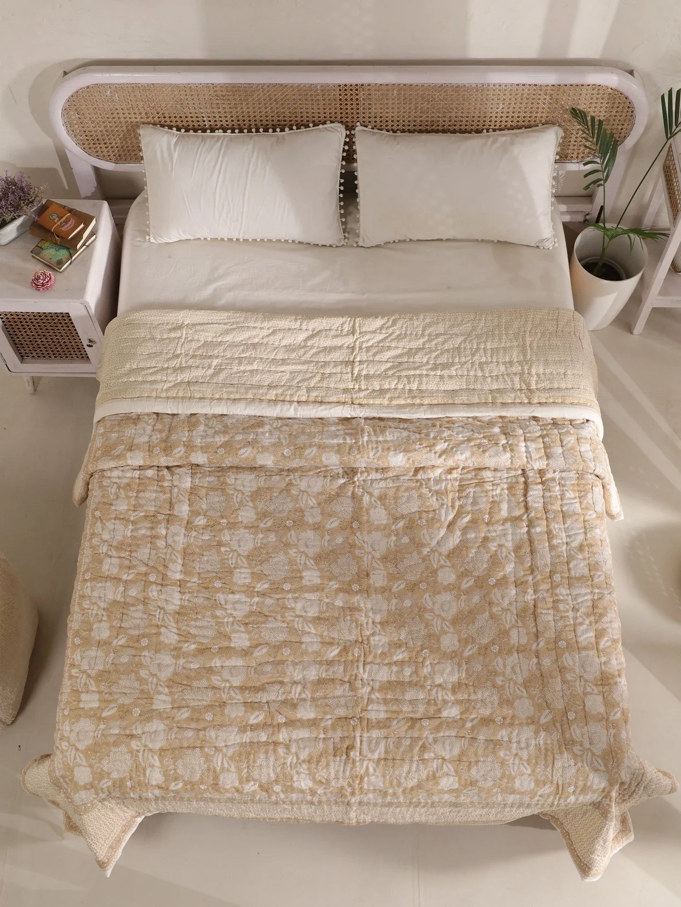 A. A Hand Block Print Mulmul Cotton Quilt is a cozy and lightweight bedding accessory crafted from soft mulmul cotton fabric. It features intricate block-printed designs created by skilled artisans using traditional wooden blocks.
