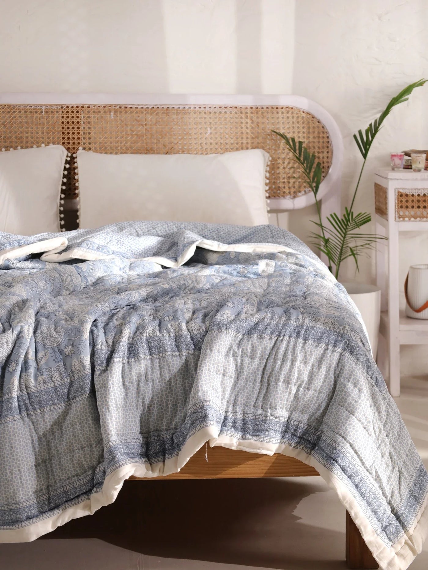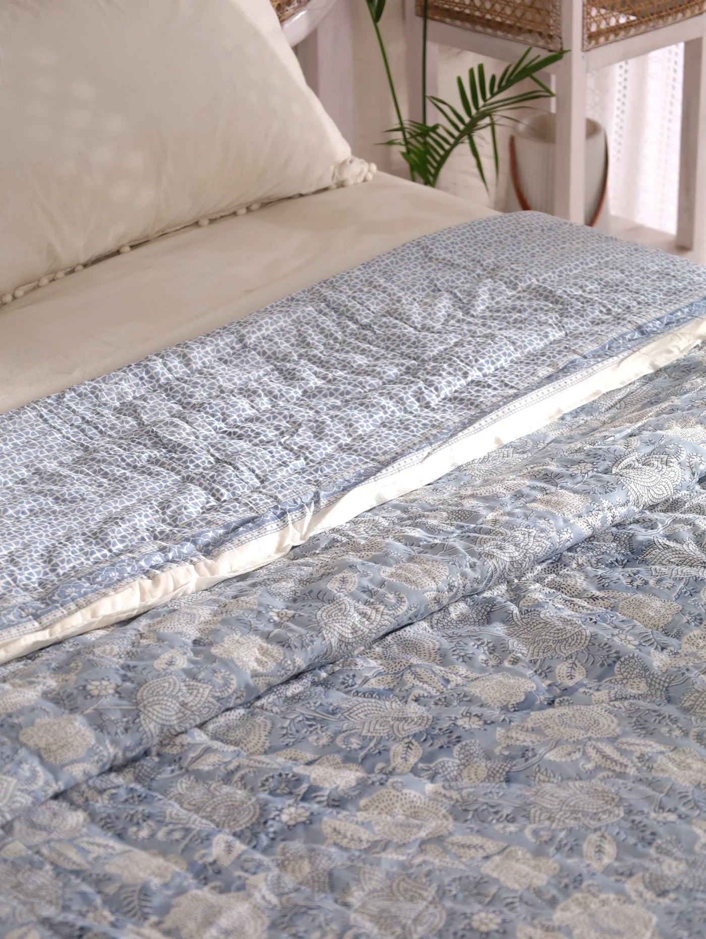 A. A Hand Block Print Mulmul Cotton Quilt is a cozy and lightweight bedding accessory crafted from soft mulmul cotton fabric. It features intricate block-printed designs created by skilled artisans using traditional wooden blocks.