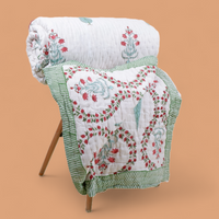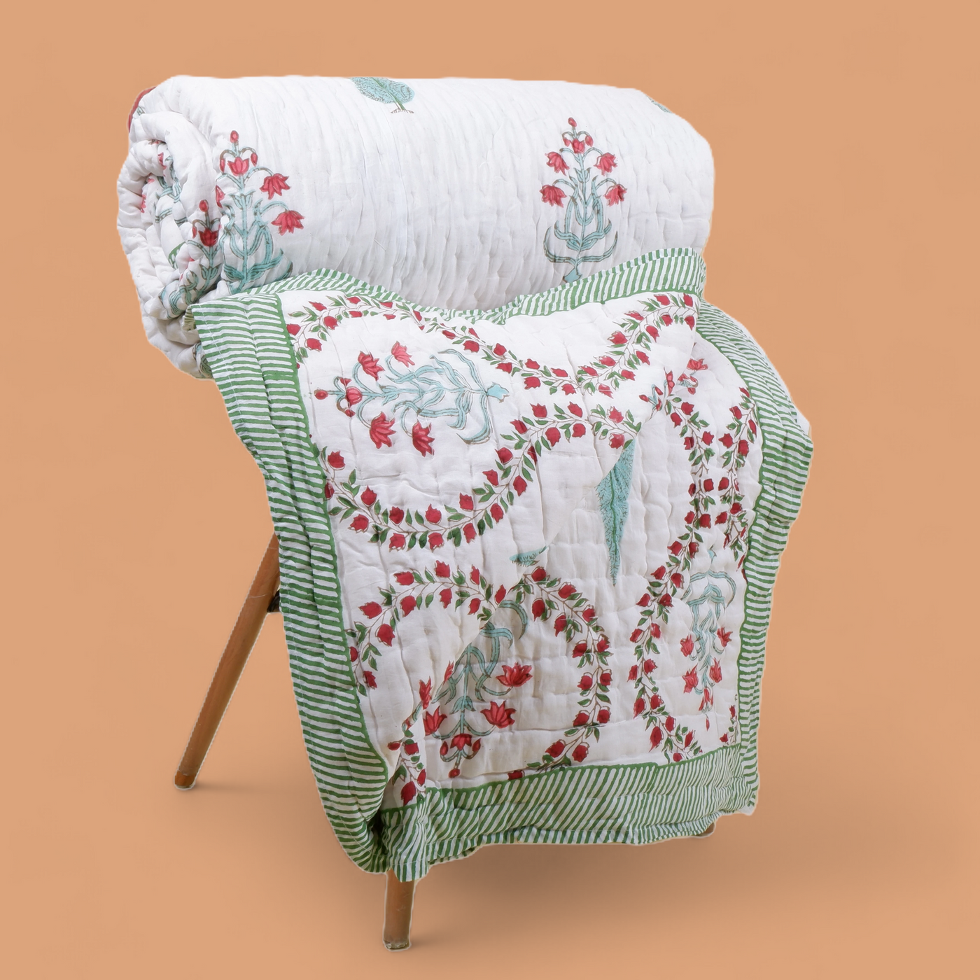 Hand Block Printed Jaipuri Cotton Quilt – Red & Green Floral Bel (90X108 Inches)