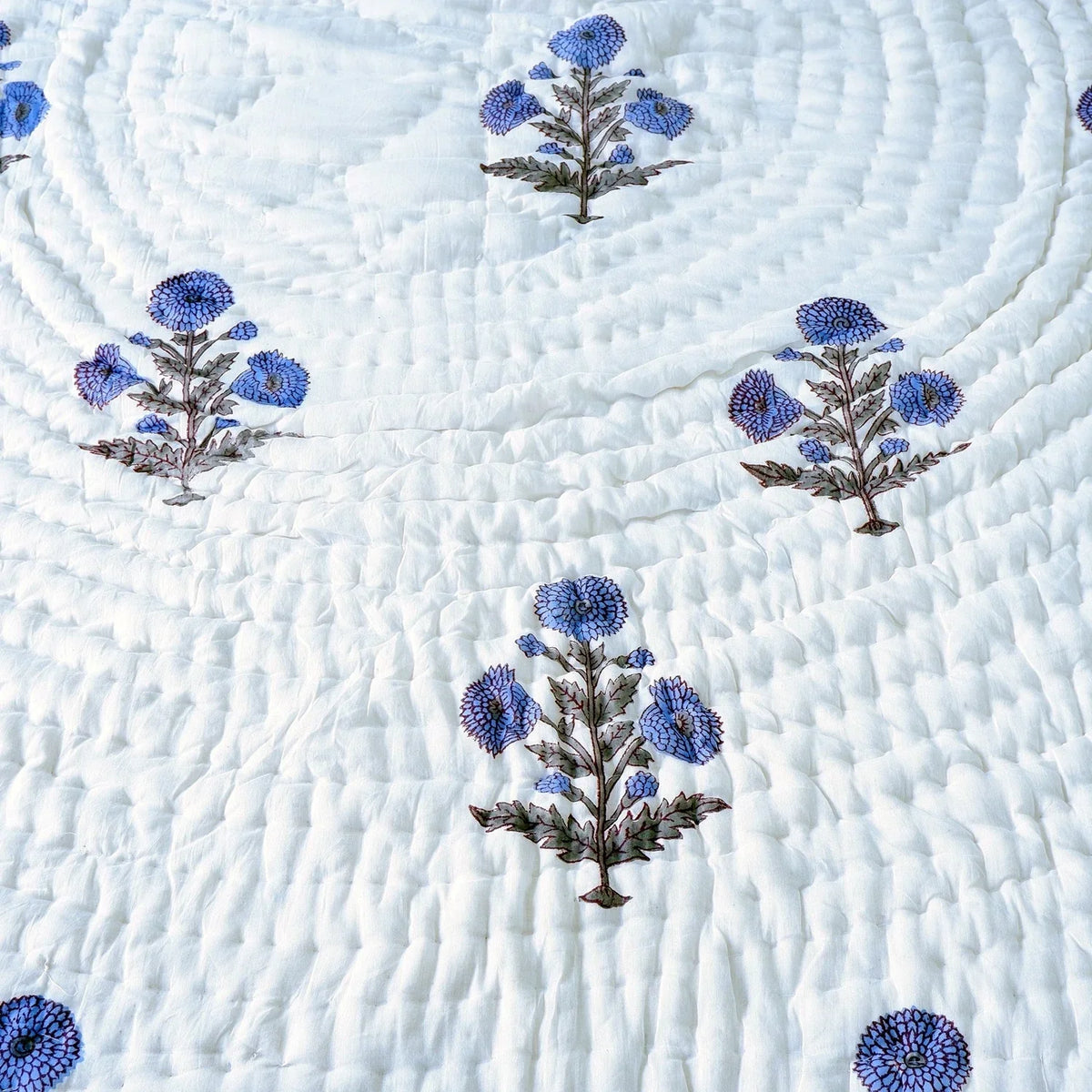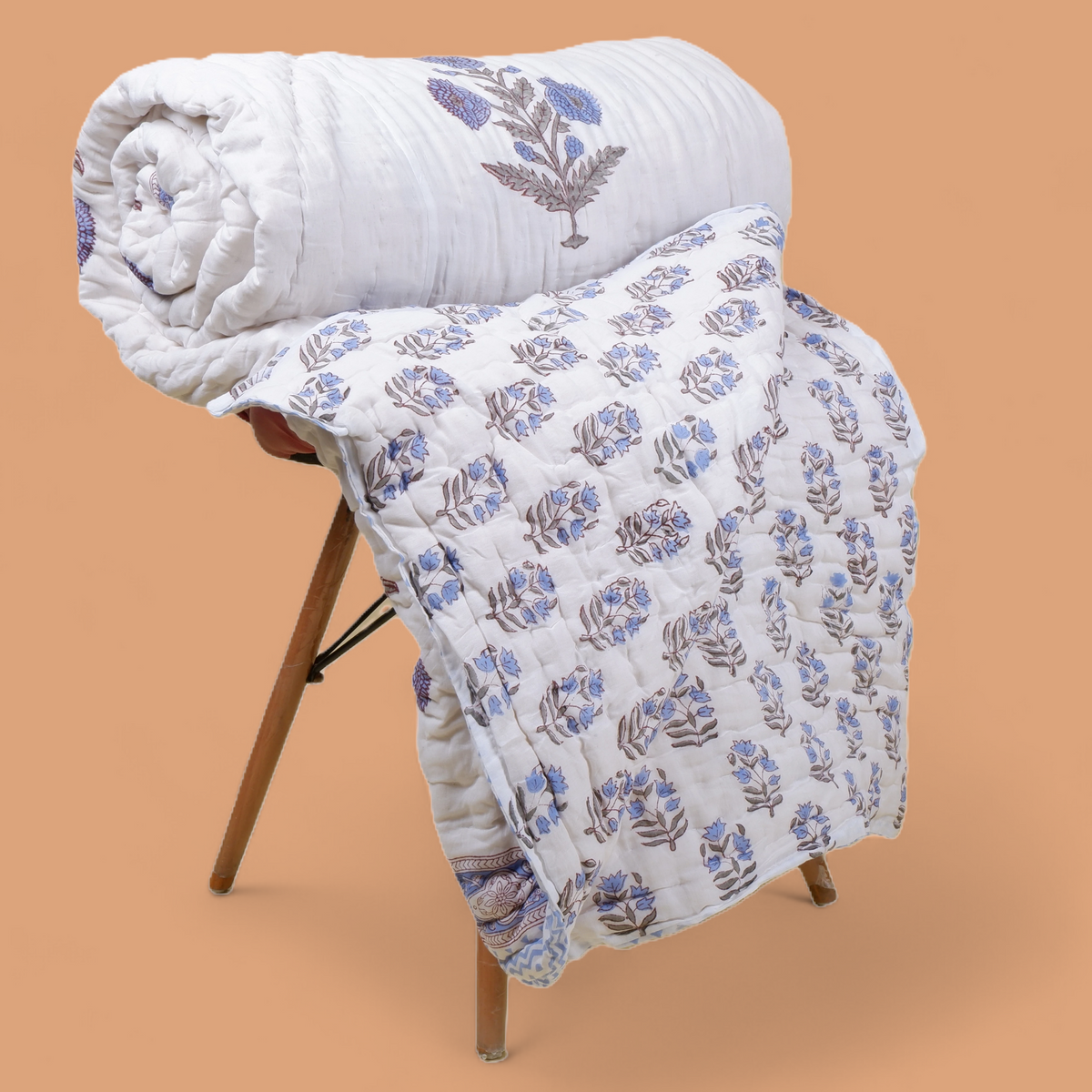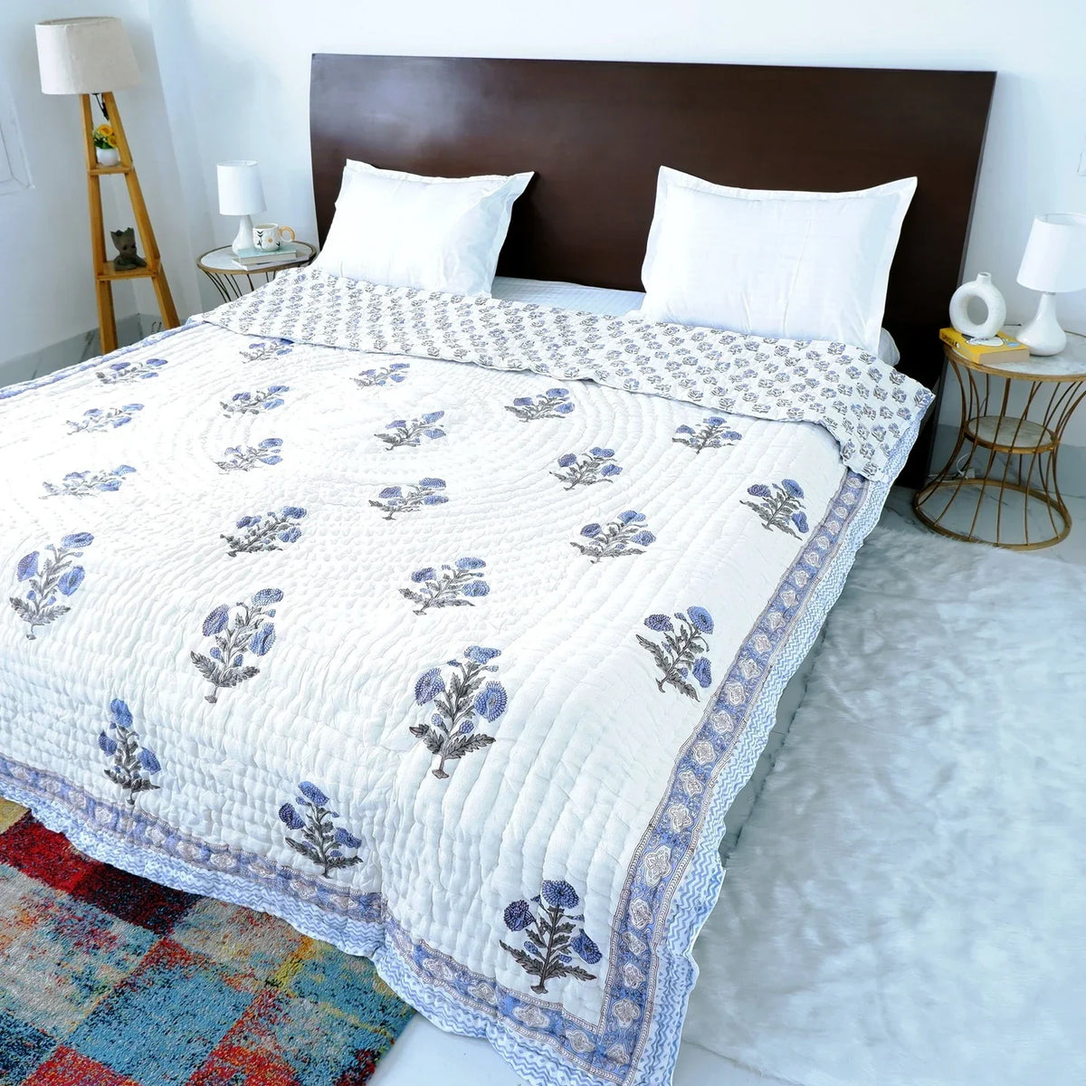 Hand Block Printed Jaipuri Cotton Quilt - Blue Floral Buta (90X108 Inches)