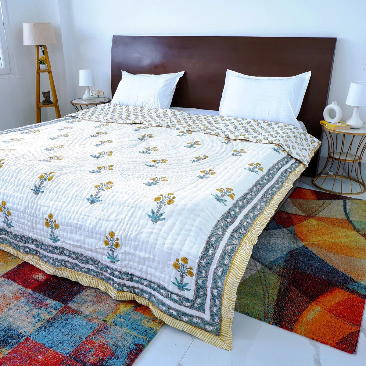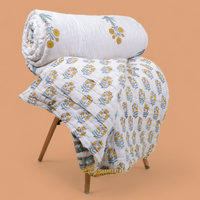 Hand Block Printed Jaipuri Cotton Quilt - Yellow Floral Buta (90X108 Inches)